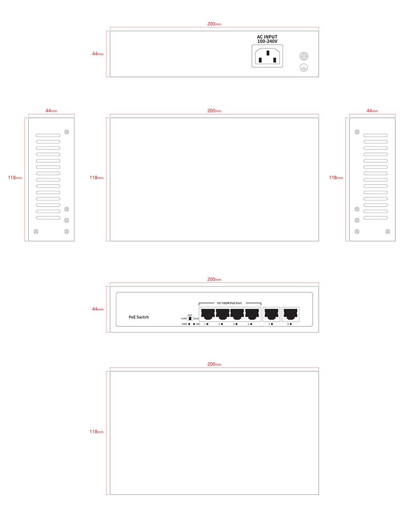 1, 4*100Mbps PoE ports+2*100Mbps uplink RJ45 ports