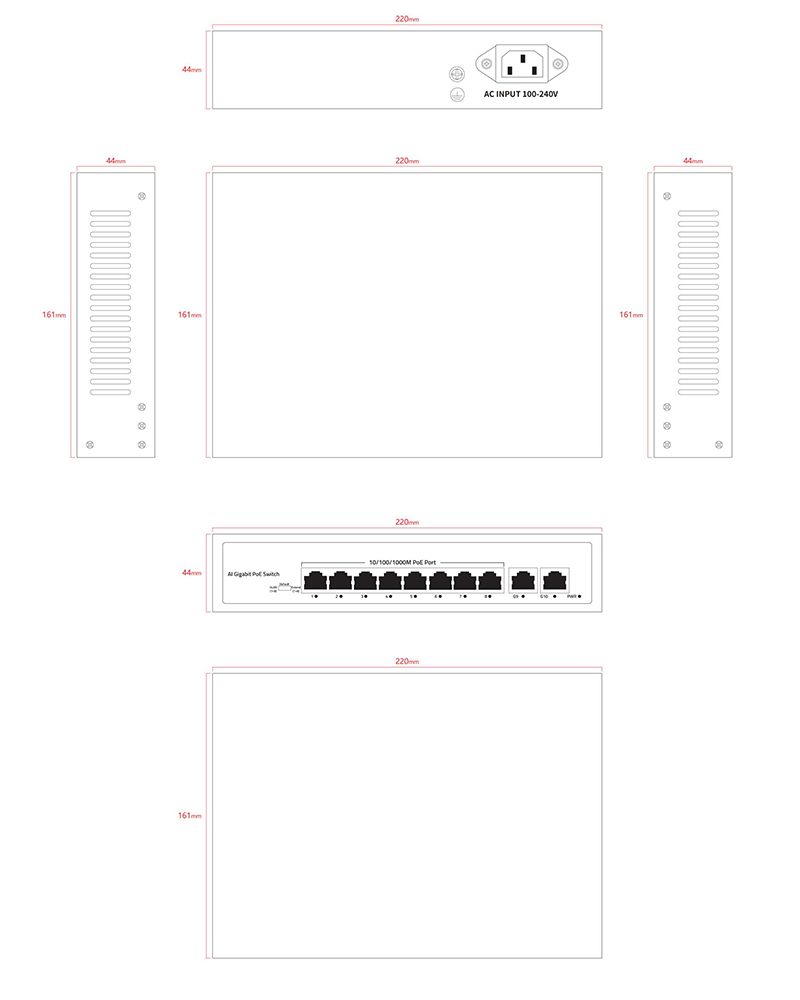 8*1Gbps PoE ports 2*1Gbps uplink RJ45 ports |