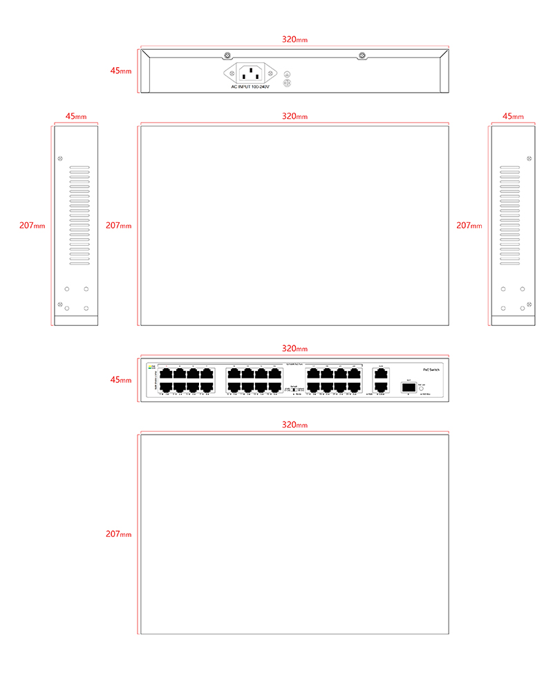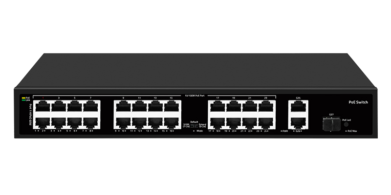 24*100Mbps PoE ports 2*1Gbps RJ45 ports 1*1Gbps SFP port |