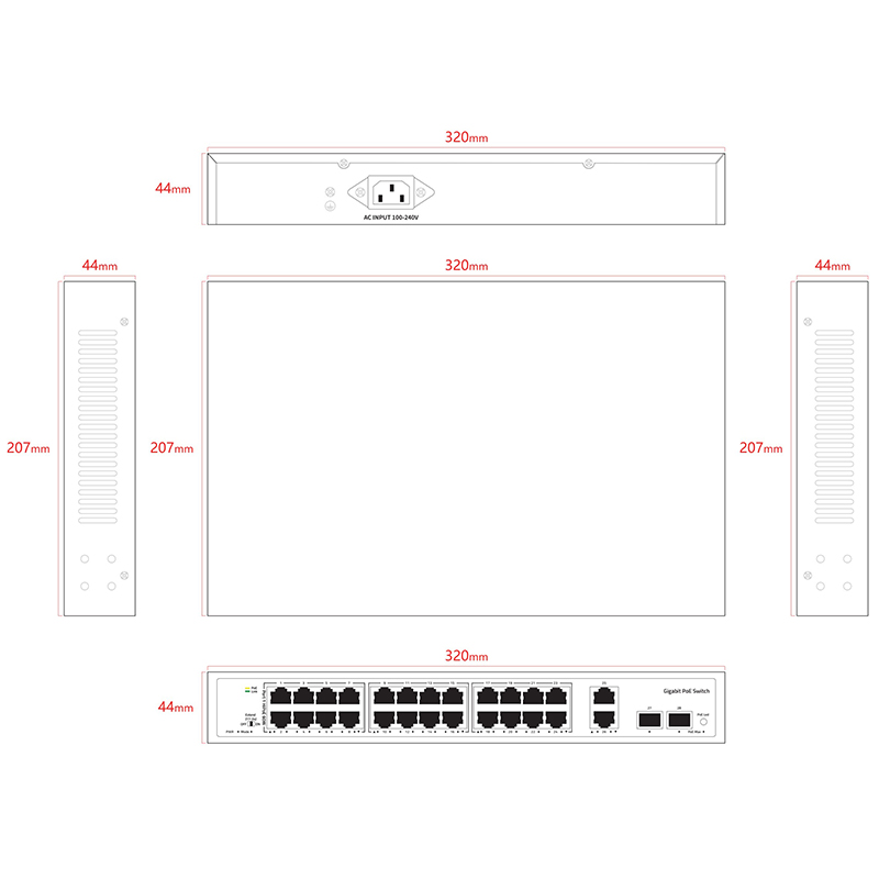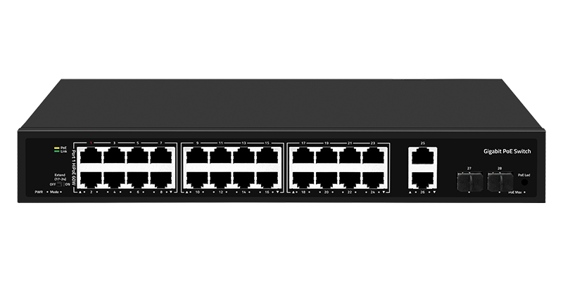 24*1Gbps PoE ports 2*1Gbps RJ45 ports 2*1Gbps SFP ports |