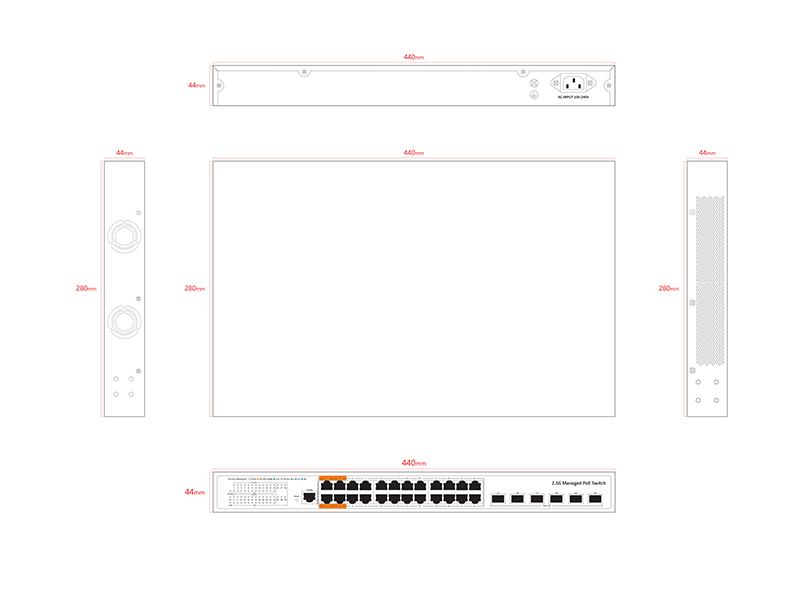 24*2.5Gbps PoE ports 6*10Gbps SFP+ ports 1*Console port |